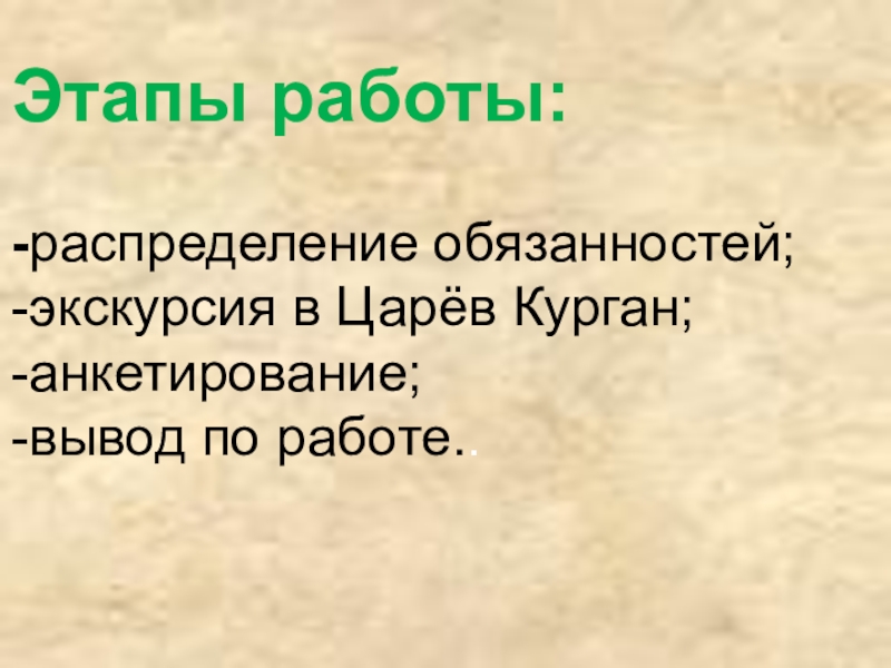 Этапы работы: -распределение обязанностей;-экскурсия в Царёв Курган;-анкетирование;-вывод по работе..
