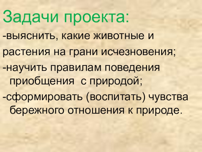 Задачи проекта:-выяснить, какие животные ирастения на грани исчезновения;-научить правилам поведения приобщения с природой;-сформировать (воспитать) чувства бережного отношения