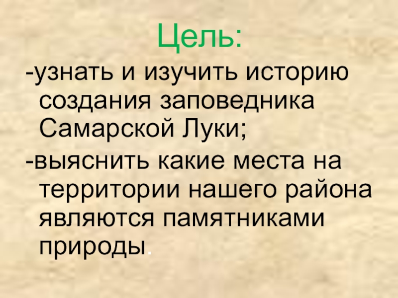Цель:-узнать и изучить историю создания заповедника Самарской Луки; -выяснить какие места на территории нашего района являются памятниками природы.