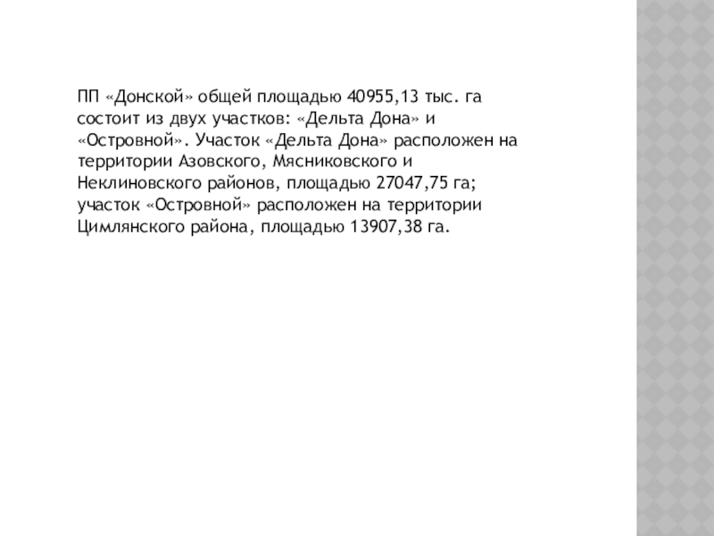Слайд 3ПП «Донской» общей площадью 40955,13 тыс. га состоит из двух участков: