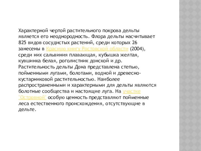 Слайд 4Характерной чертой растительного покрова дельты является его неоднородность. Флора дельты насчитывает