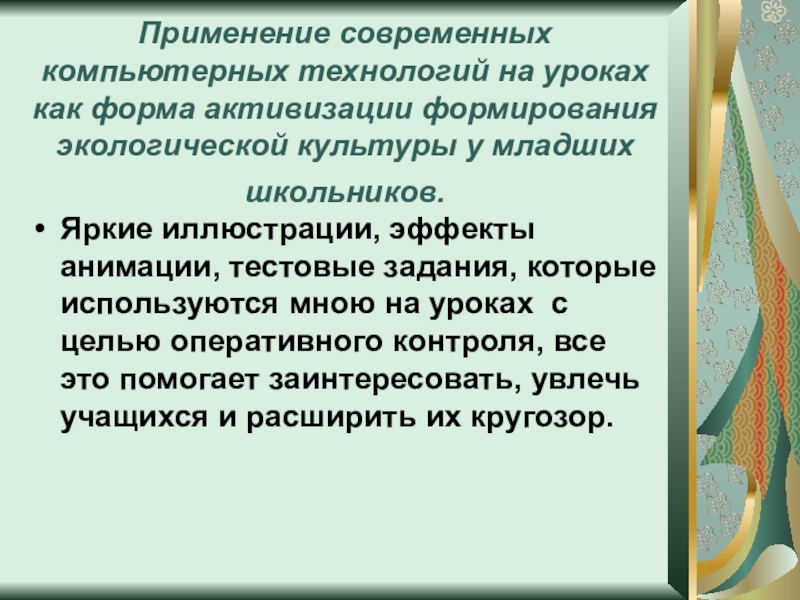 Яркие иллюстрации, эффекты анимации, тестовые задания, которые используются мною на уроках с целью оперативного контроля, все это помогает заинтересовать, увлечь учащихся и расширить их кругозор.