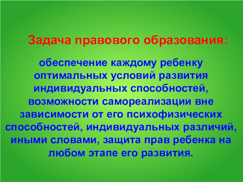 возможности самореализации вне зависимости от его психофизических способностей, индивидуальных различий, иными словами, защита прав ребенка на любом этапе его развития.