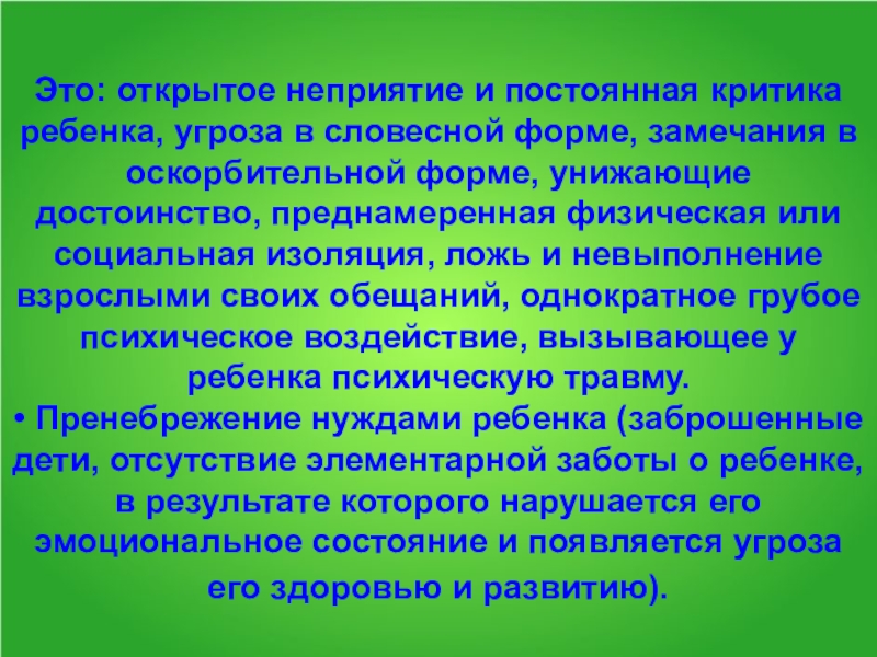 замечания в оскорбительной форме, унижающие достоинство, преднамеренная физическая или социальная изоляция, ложь и невыполнение взрослыми своих обещаний, однократное грубое психическое воздействие, вызывающее у ребенка психическую травму.
