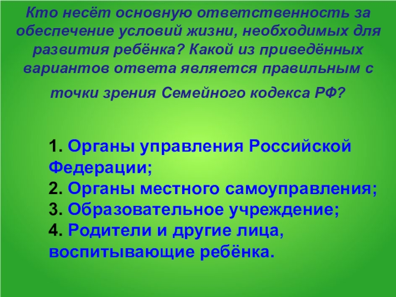 Слайд 13Кто несёт основную ответственность за обеспечение условий жизни, необходимых для развития