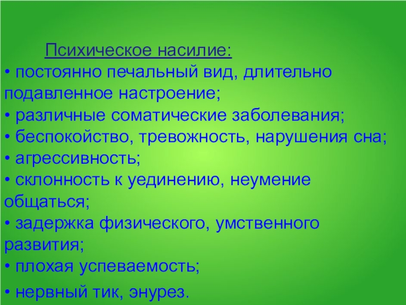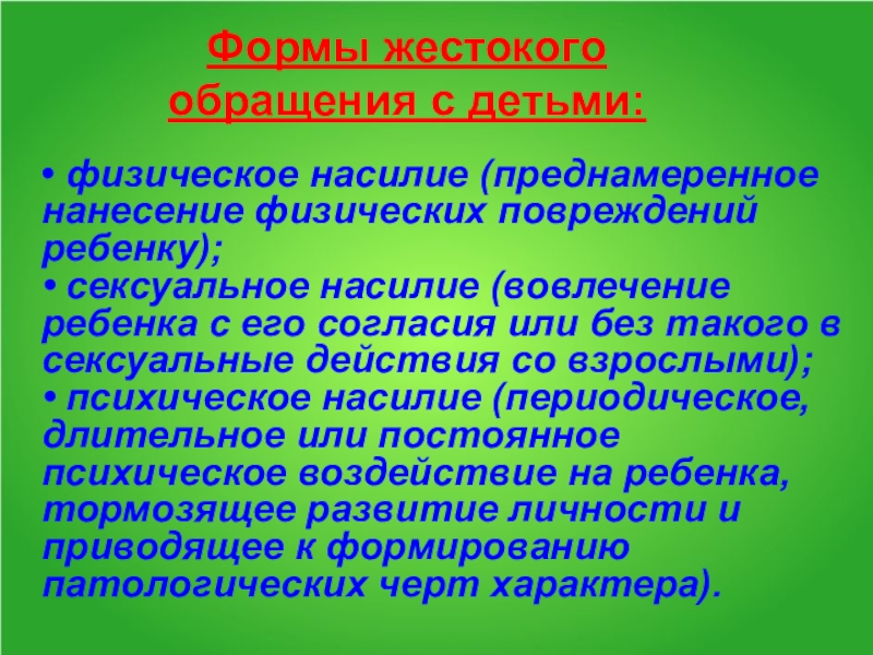 • психическое насилие (периодическое, длительное или постоянное психическое воздействие на ребенка, тормозящее развитие личности и приводящее к формированию патологических черт характера).