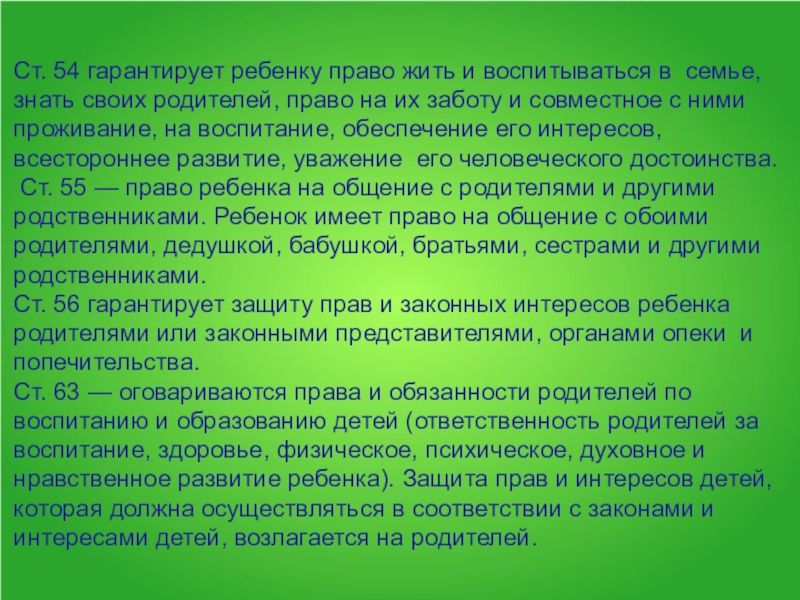 Ст. 54 гарантирует ребенку право жить и воспитываться в семье, знать своих родителей, право на их заботу и совместное с ними проживание, на воспитание, обеспечение его интересов, всестороннее развитие, уважение его человеческого достоинства.