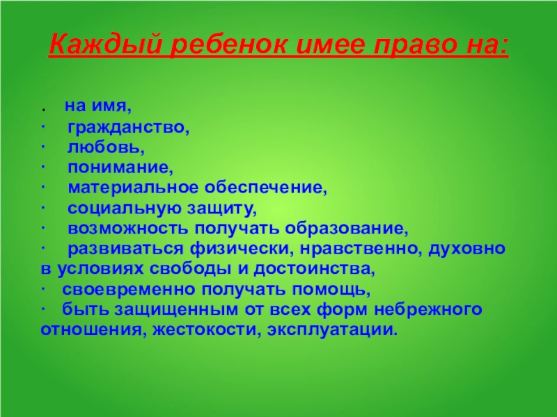 · быть защищенным от всех форм небрежного отношения, жестокости, эксплуатации.