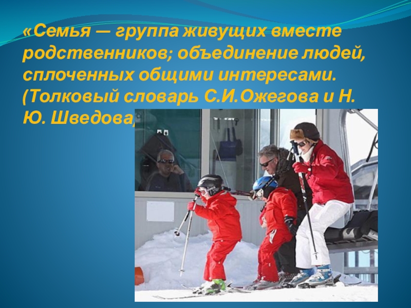 Слайд 2«Семья — группа живущих вместе родственников; объединение людей, сплоченных общими интересами.