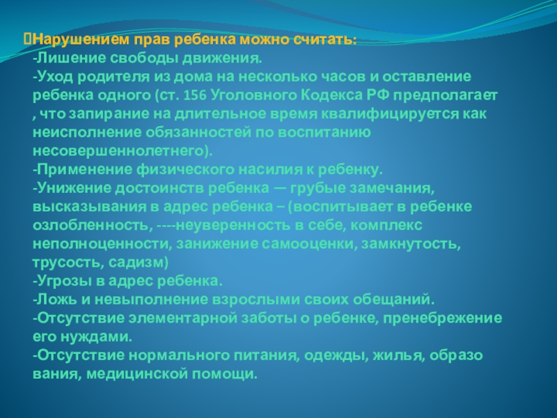ребенку со стороны родителей, лиц, их замещающих, или других взрослых, в результате чего нарушается здоровье и благополучие ребенка или создаются условия, мешающие его оптимальному физическому или психическому развитию, ущемляются его права и свобода.
