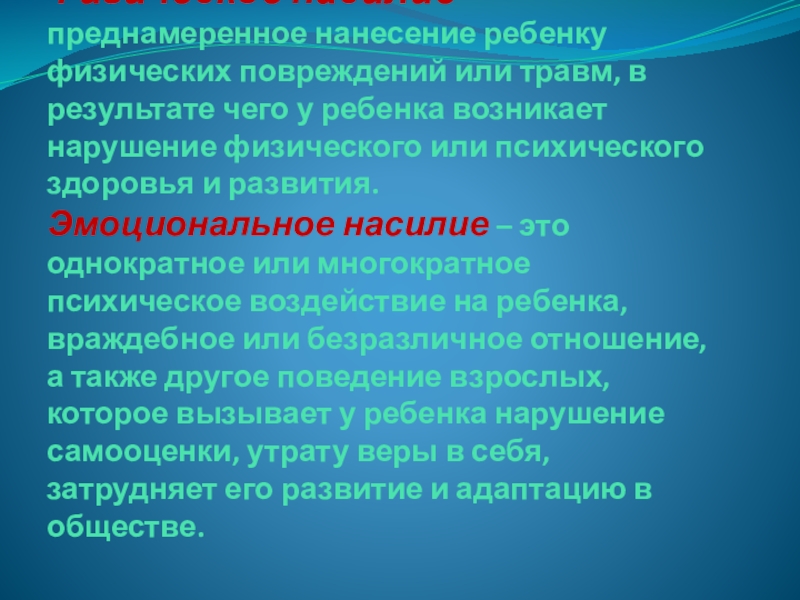 Слайд 13Физическое насилие — преднамеренное нанесение ребенку физических повреждений или травм, в