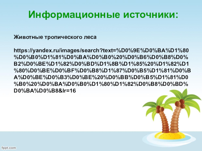 Информационные источники:Животные тропического лесаhttps://yandex.ru/images/search?text=%D0%9E%D0%BA%D1%80%D0%B0%D1%81%D0%BA%D0%B0%20%D0%B6%D0%B8%D0%B2%D0%BE%D1%82%D0%BD%D1%8B%D1%85%20%D1%82%D1%80%D0%BE%D0%BF%D0%B8%D1%87%D0%B5%D1%81%D0%BA%D0%BE%D0%B3%D0%BE%20%D0%BB%D0%B5%D1%81%D0%B0%20%D0%BA%D0%B0%D1%80%D1%82%D0%B8%D0%BD%D0%BA%D0%B8&lr=16