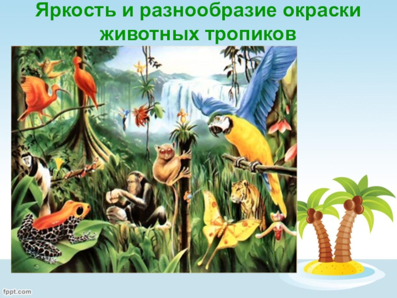 Слайд 3Яркость и разнообразие окраски животных тропиков