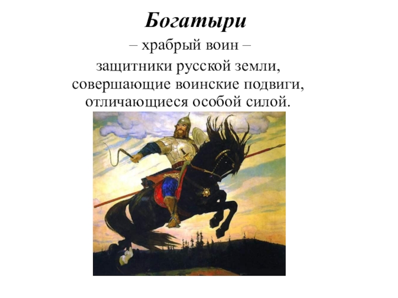 Богатыри – храбрый воин –защитники русской земли, совершающие воинские подвиги, отличающиеся особой силой.