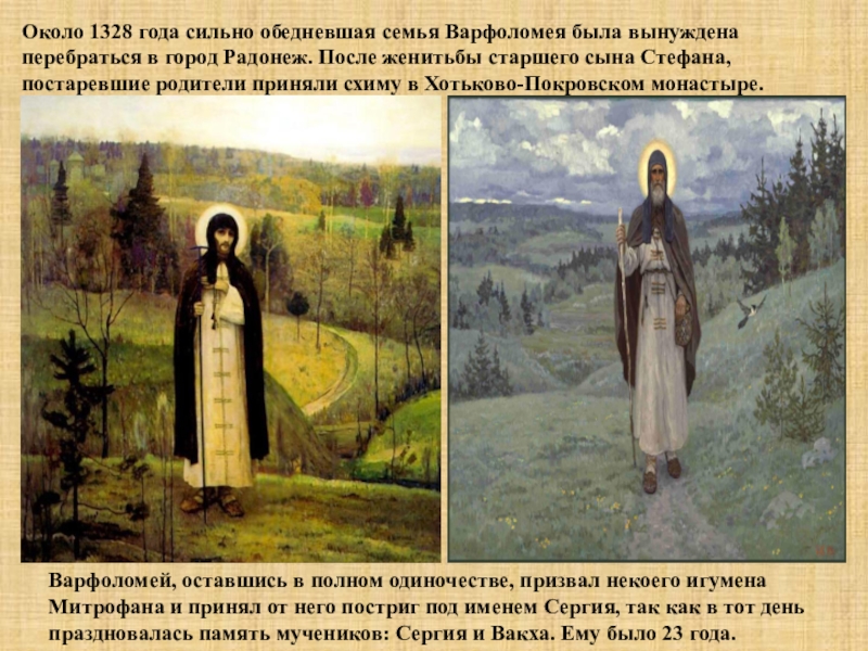 Варфоломей, оставшись в полном одиночестве, призвал некоего игумена Митрофана и принял от него постриг под именем Сергия, так как в тот день праздновалась память мучеников: Сергия и Вакха. Ему было 23 года.
