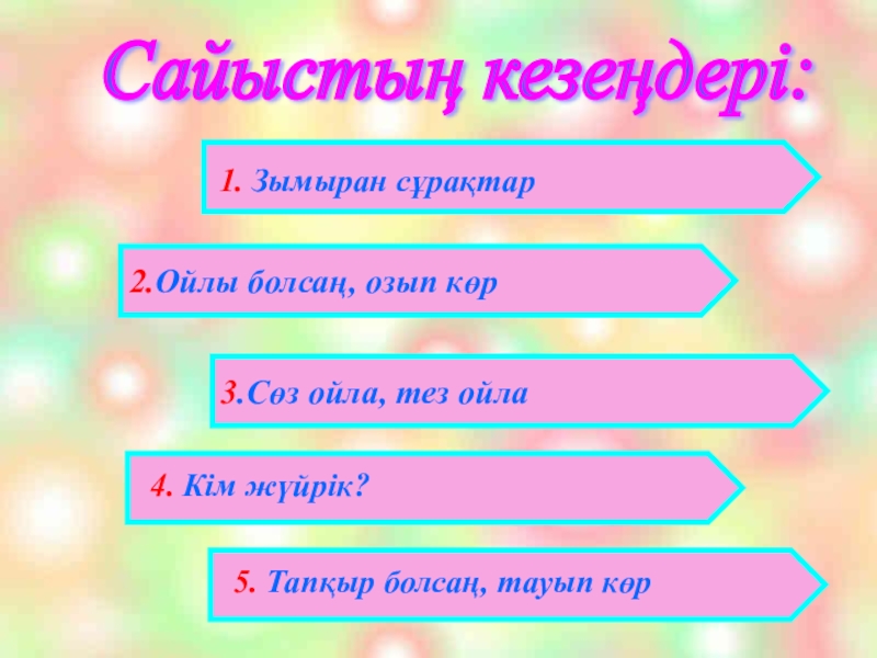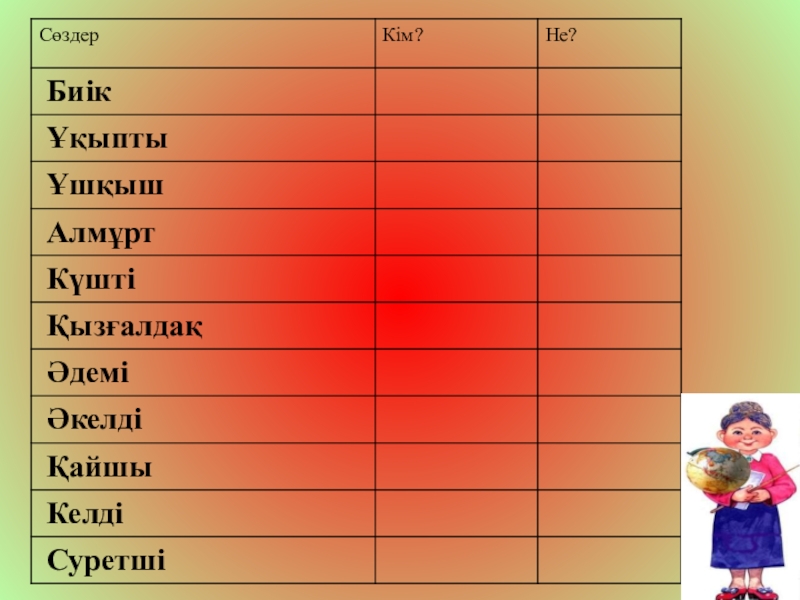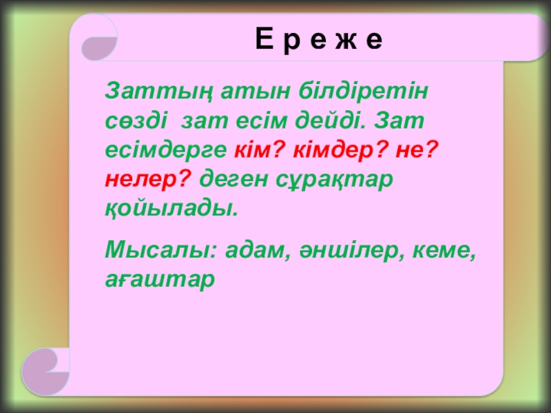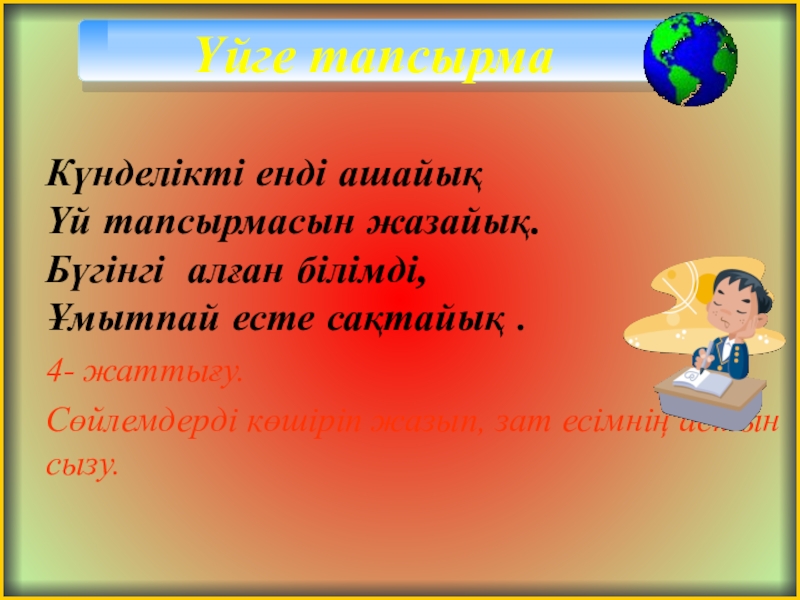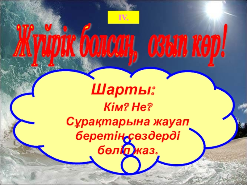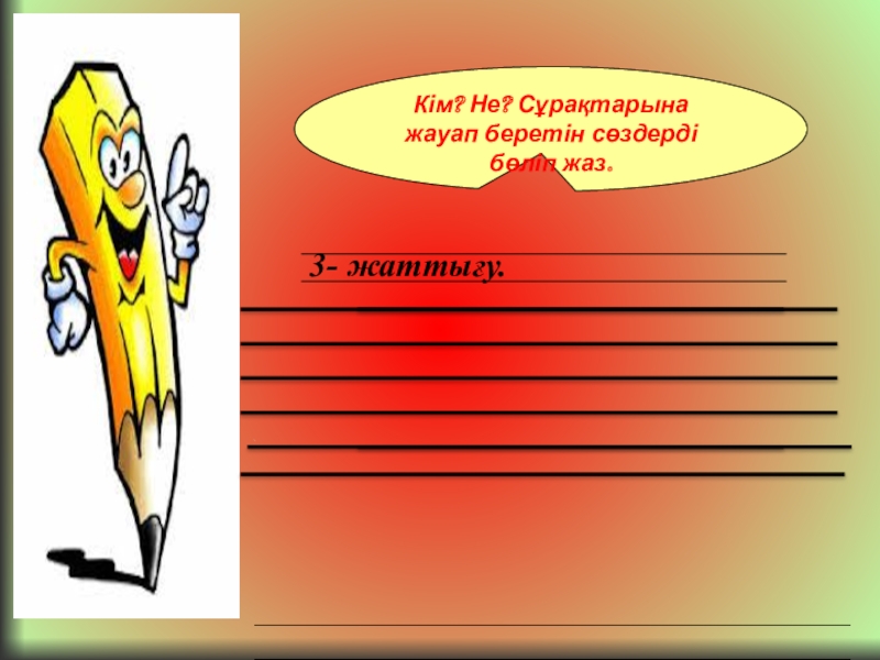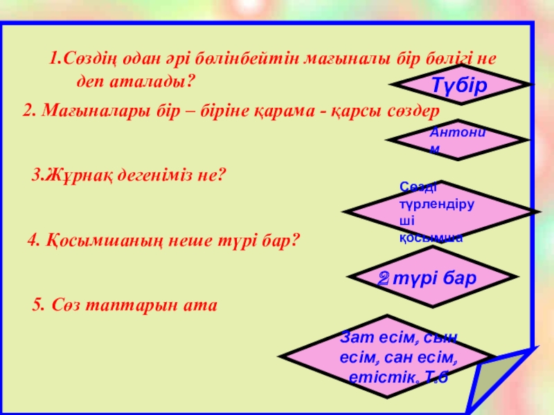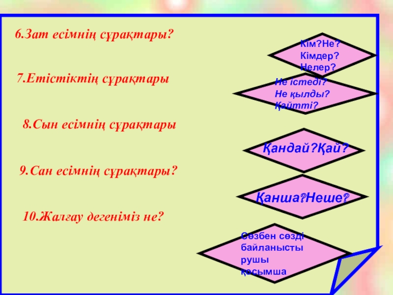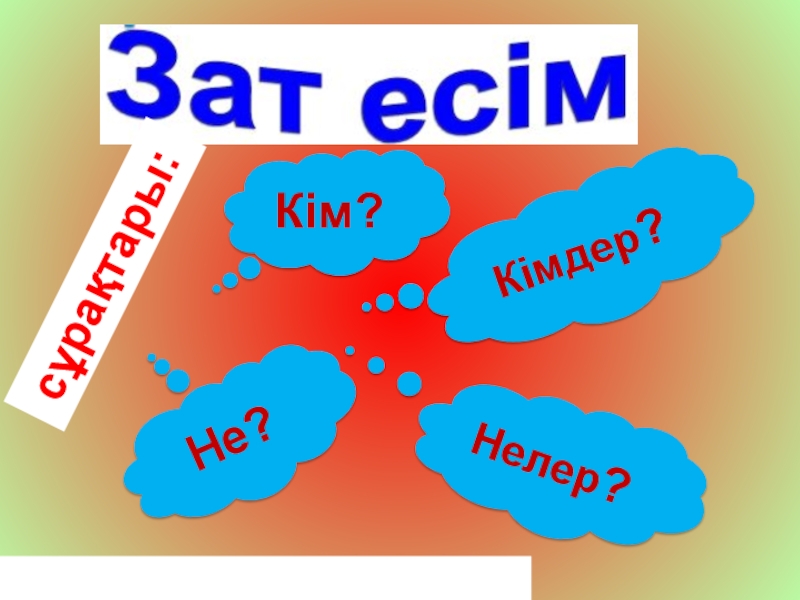 Зат есім, сын есім, сан есім, етістік. Т.б