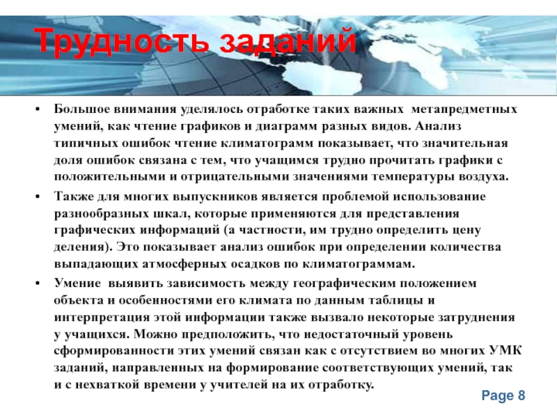 Также для многих выпускников является проблемой использование разнообразных шкал, которые применяются для представления графических информаций (а частности, им трудно определить цену деления). Это показывает анализ ошибок при определении количества выпадающих атмосферных осадков по климатограммам.