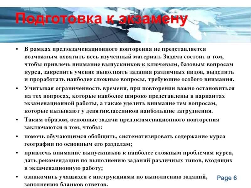 Наряду с отмеченными выше факторами подготовки к экзамену, позитивную роль могут сыграть и специальные занятия предэкзаменационного повторения, которые целенаправленно используются для активизации знаний учащихся по проверяемым в рамках экзамена элементам содержания, ознакомления со всеми видами заданий экзаменационной работы по географии и выполнения тренировочных заданий по всем разделам курса.