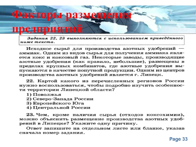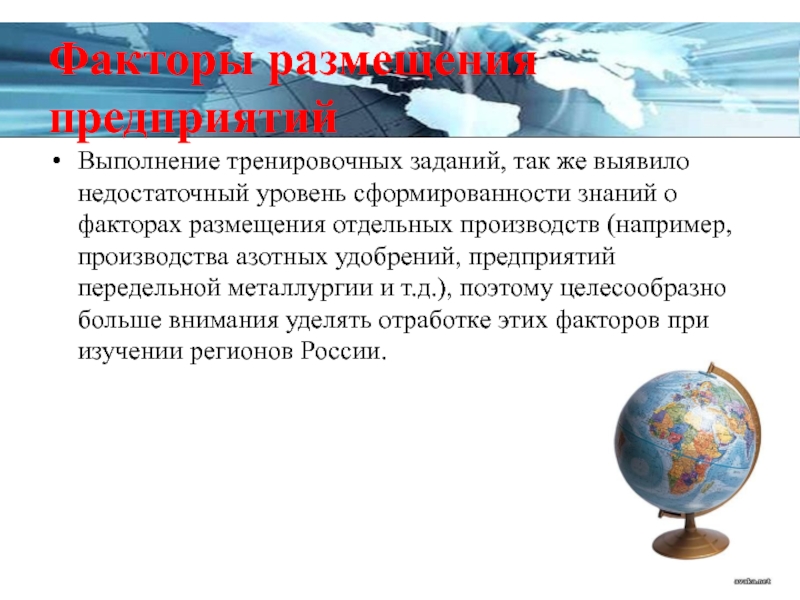 знаний о факторах размещения отдельных производств (например, производства азотных удобрений, предприятий передельной металлургии и т.д.), поэтому целесообразно больше внимания уделять отработке этих факторов при изучении регионов России.