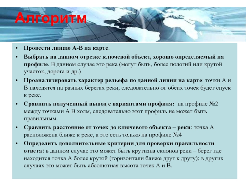 Определить дополнительные критерии для проверки правильности ответа: в данном случае это может быть крутизна склонов реки – берег где находится точка А более крутой (горизонтали ближе друг к другу); в других случаях это может быть абсолютная высота точек А и В.