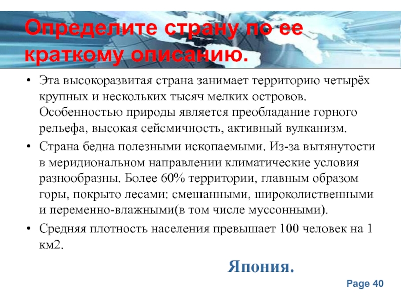 Слайд 40Определите страну по ее краткому описанию.