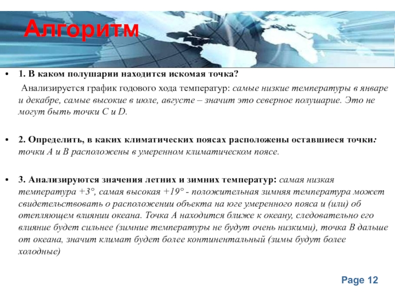 график годового хода температур: самые низкие температуры в январе и декабре, самые высокие в июле, августе – значит это северное полушарие. Это не могут быть точки C и D.