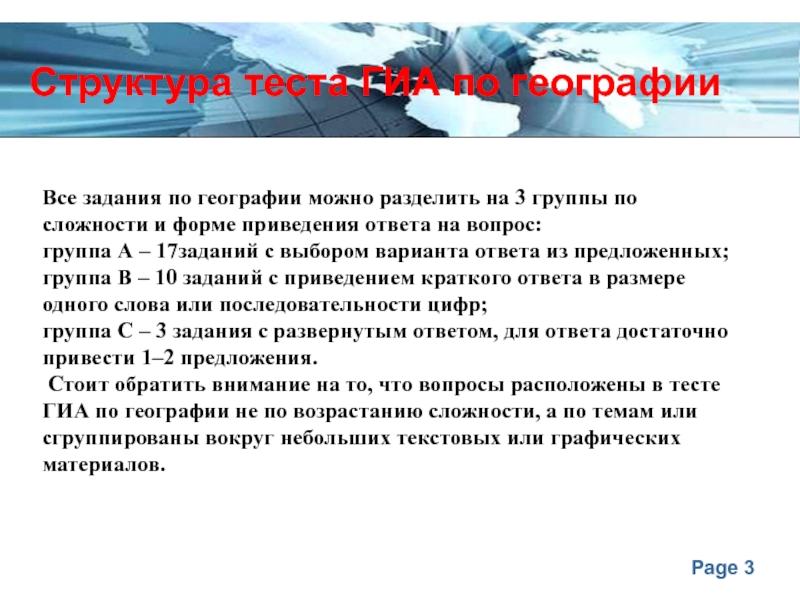 Слайд 3Структура теста ГИА по географии