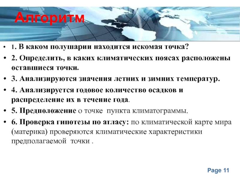6. Проверка гипотезы по атласу: по климатической карте мира (материка) проверяются климатические характеристики предполагаемой точки .