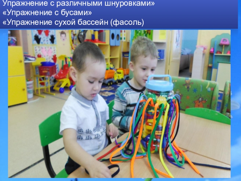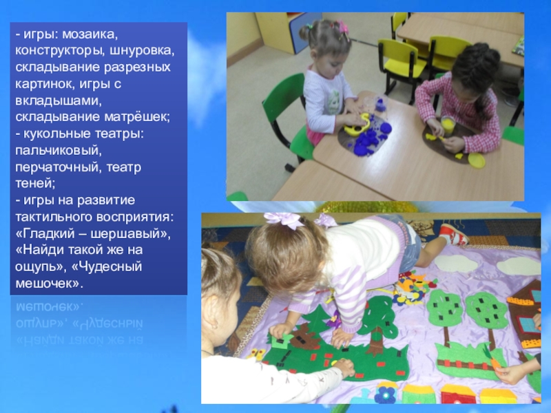 Слайд 8- игры: мозаика, конструкторы, шнуровка, складывание разрезных картинок, игры с вкладышами,