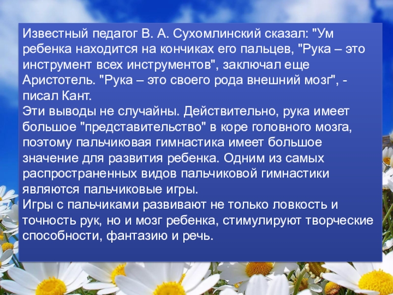 Слайд 3Известный педагог В. А. Сухомлинский сказал: "Ум ребенка находится на кончиках