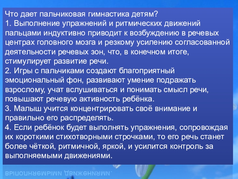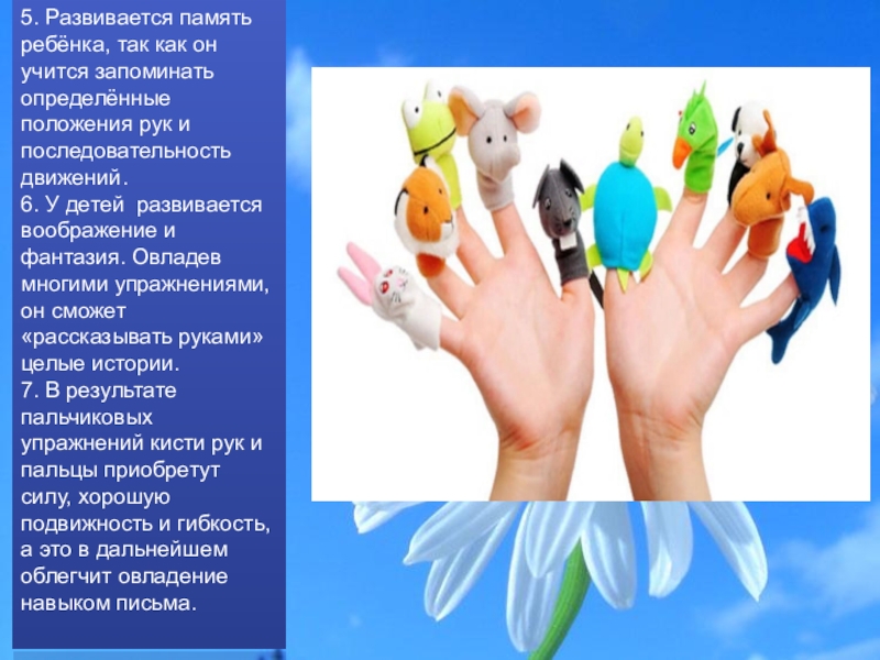 Слайд 13Что дает пальчиковая гимнастика детям?