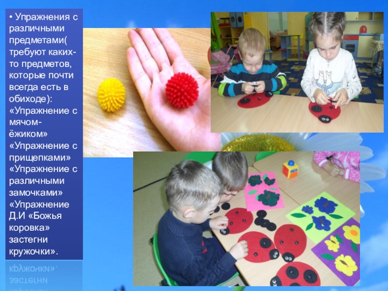 Слайд 11• Упражнения с различными предметами( требуют каких-то предметов, которые почти всегда