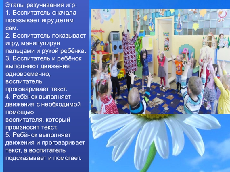 5. Ребёнок выполняет движения и проговаривает текст, а воспитатель подсказывает и помогает.