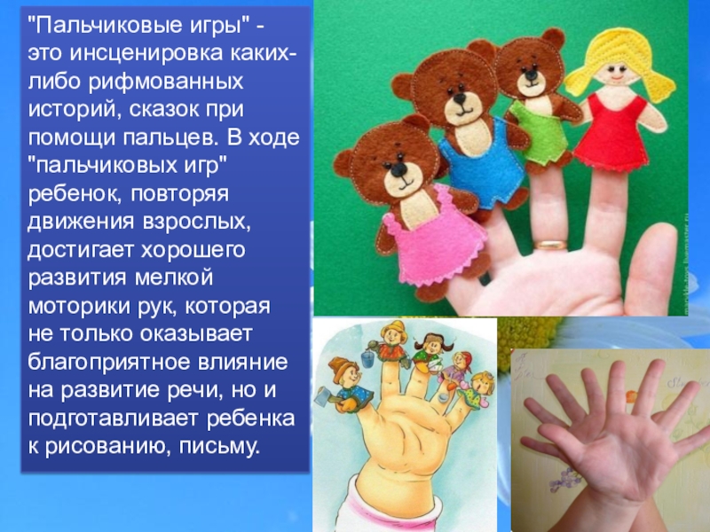 Слайд 5"Пальчиковые игры" - это инсценировка каких-либо рифмованных историй, сказок при помощи