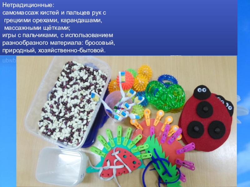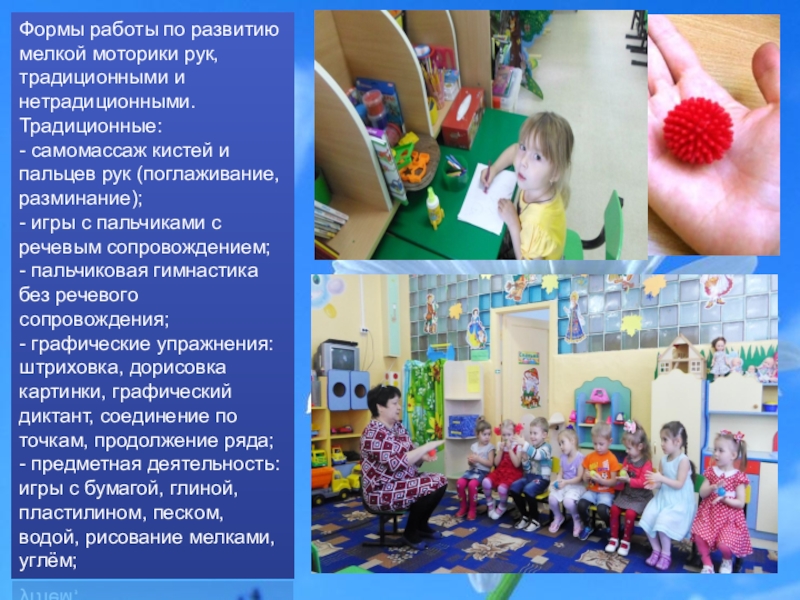 Слайд 7Формы работы по развитию мелкой моторики рук, традиционными и нетрадиционными.