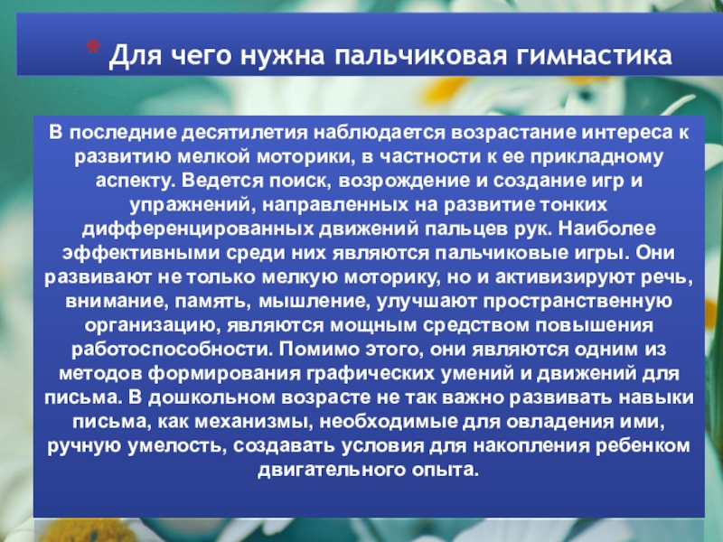 развитию мелкой моторики, в частности к ее прикладному аспекту. Ведется поиск, возрождение и создание игр и упражнений, направленных на развитие тонких дифференцированных движений пальцев рук. Наиболее эффективными среди них являются пальчиковые игры. Они развивают не только мелкую моторику, но и активизируют речь, внимание, память, мышление, улучшают пространственную организацию, являются мощным средством повышения работоспособности. Помимо этого, они являются одним из методов формирования графических умений и движений для письма. В дошкольном возрасте не так важно развивать навыки письма, как механизмы, необходимые для овладения ими, ручную умелость, создавать условия для накопления ребенком двигательного опыта.