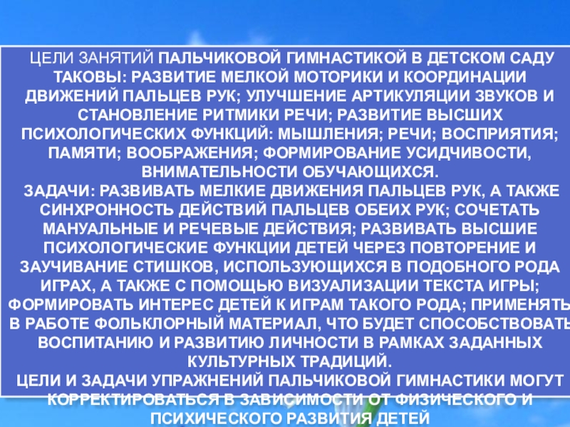 ЦЕЛИ И ЗАДАЧИ УПРАЖНЕНИЙ ПАЛЬЧИКОВОЙ ГИМНАСТИКИ МОГУТ КОРРЕКТИРОВАТЬСЯ В ЗАВИСИМОСТИ ОТ ФИЗИЧЕСКОГО И ПСИХИЧЕСКОГО РАЗВИТИЯ ДЕТЕЙ
