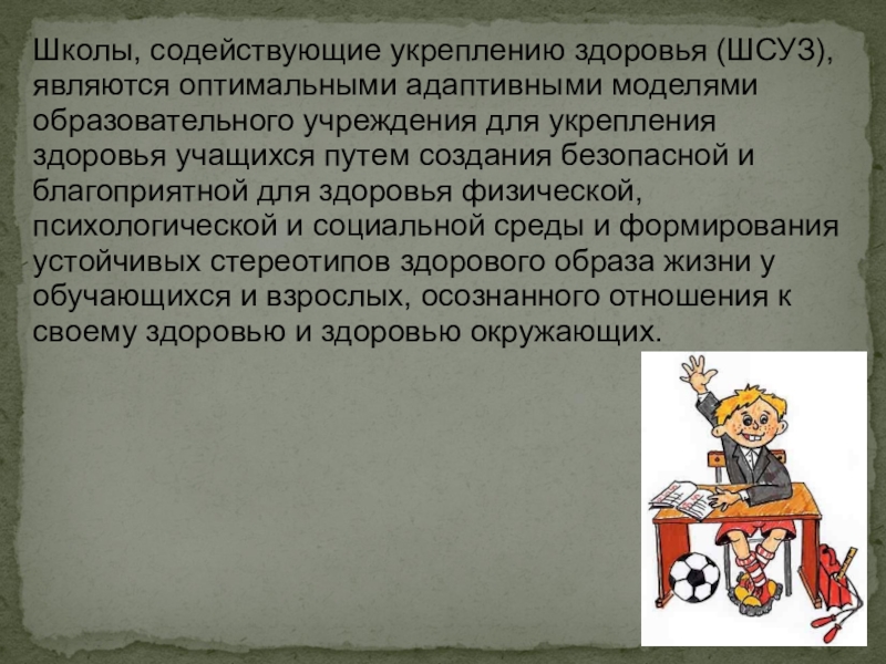 Школы, содействующие укреплению здоровья (ШСУЗ), являются оптимальными адаптивными моделями образовательного учреждения для укрепления здоровья учащихся путем создания безопасной и благоприятной для здоровья физической, психологической и социальной среды и формирования устойчивых стереотипов здорового образа жизни у обучающихся