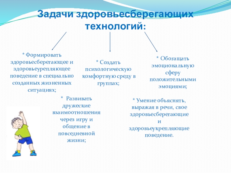 Цель здоровьесберегающих технологий: формирование осознанного отношения к соблюдению культурно-гигиенических навыков и здоровьесберегающее поведение в повседневной жизни, эмоциональное благополучие, социальные навыки и уверенность в себе.