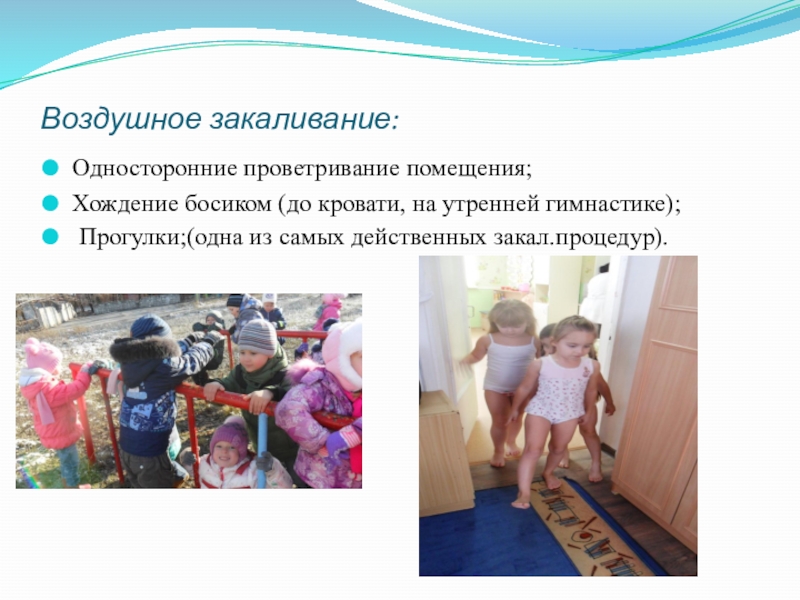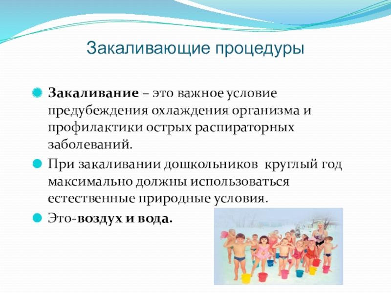 При закаливании дошкольников круглый год максимально должны использоваться естественные природные условия.