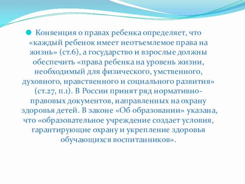 на жизнь» (ст.6), а государство и взрослые должны обеспечить «права ребенка на уровень жизни, необходимый для физического, умственного, духовного, нравственного и социального развития» (ст.27, п.1). В России принят ряд нормативно-правовых документов, направленных на охрану здоровья детей. В законе «Об образовании» указана, что «образовательное учреждение создает условия, гарантирующие охрану и укрепление здоровья обучающихся воспитанников».