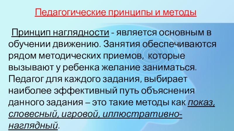 движению. Занятия обеспечиваются рядом методических приемов, которые вызывают у ребенка желание заниматься. Педагог для каждого задания, выбирает наиболее эффективный путь объяснения данного задания – это такие методы как показ, словесный, игровой, иллюстративно-наглядный.