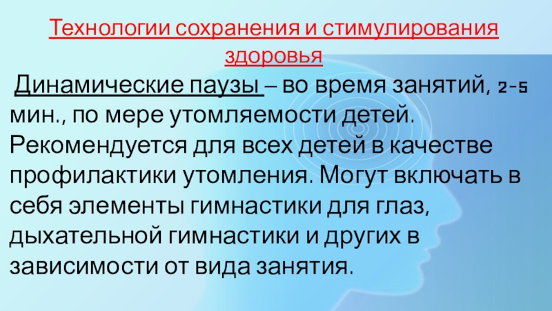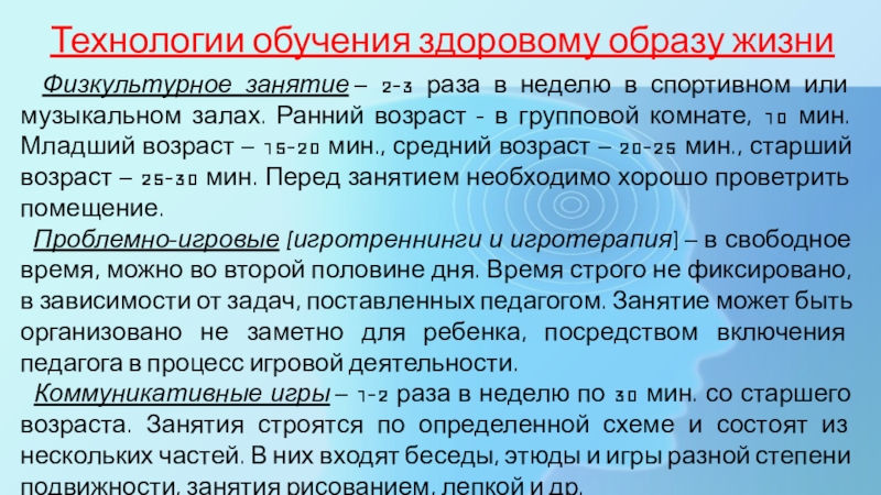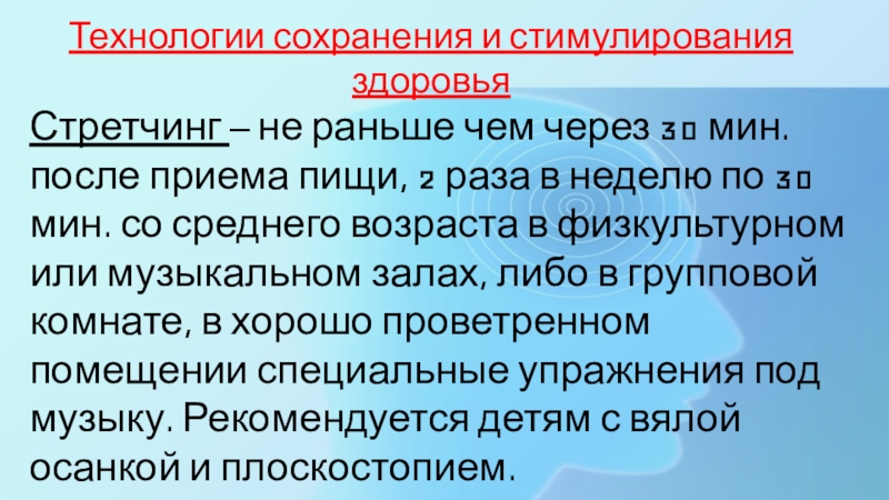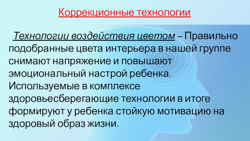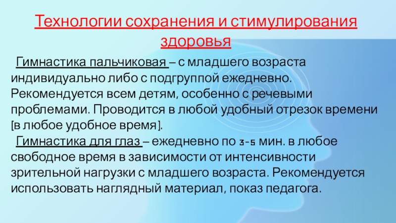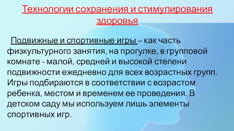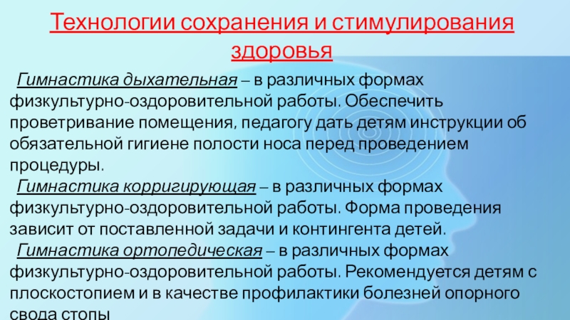 использованию технологий сохранения и стимулирования здоровья , а также технологиям обучению здоровому образу жизни и коррекционным технологиям