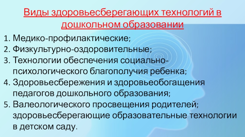 Слайд 4Виды здоровьесберегающих технологий в дошкольном образовании