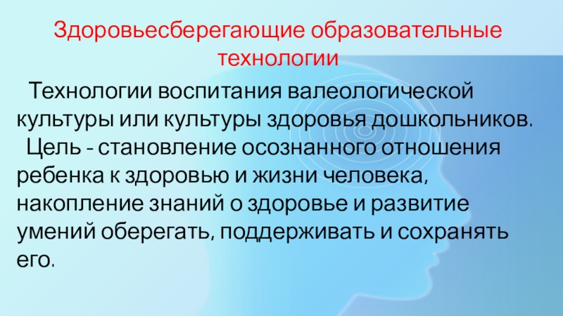 Валеологического просвещения родителей; здоровьесберегающие образовательные технологии в детском саду.