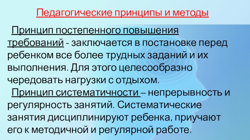 Принцип систематичности – непрерывность и регулярность занятий. Систематические занятия дисциплинируют ребенка, приучают его к методичной и регулярной работе.