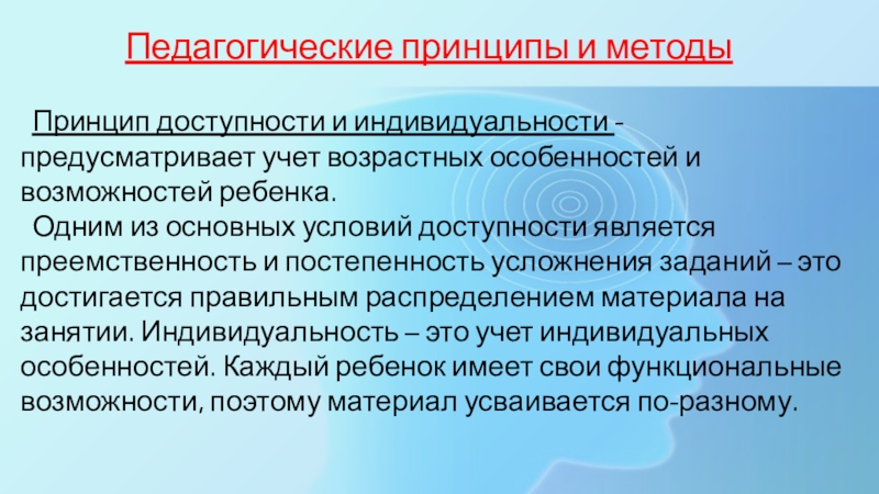 Одним из основных условий доступности является преемственность и постепенность усложнения заданий – это достигается правильным распределением материала на занятии. Индивидуальность – это учет индивидуальных особенностей. Каждый ребенок имеет свои функциональные возможности, поэтому материал усваивается по-разному.