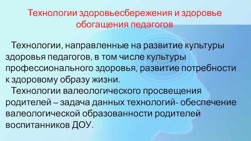 Слайд 9Технологии здоровьесбережения и здоровье обогащения педагогов