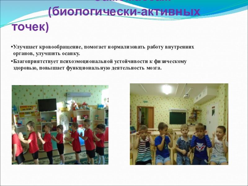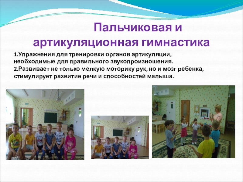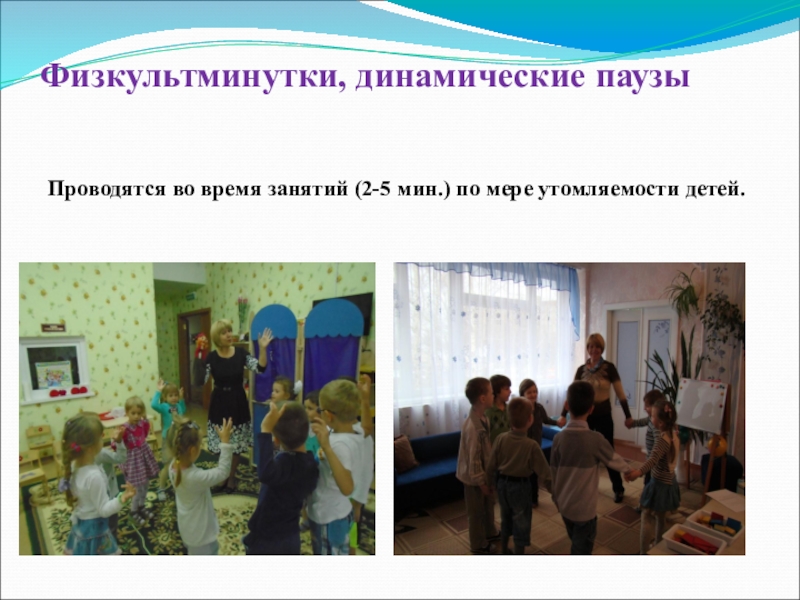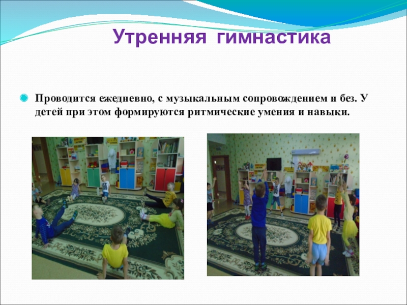 Проводится ежедневно, с музыкальным сопровождением и без. У детей при этом формируются ритмические умения и навыки.