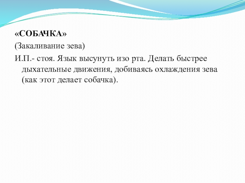 И.П.- стоя. Язык высунуть изо рта. Делать быстрее дыхательные движения,